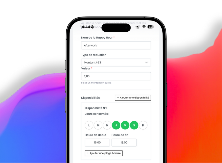 Oui. Vous définissez des plages horaires par catégorie et des happy hours multi-créneaux avec tarifs dédiés.