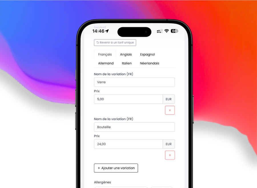 Oui. Créez des options, variantes et déclinaisons de prix par plat pour refléter précisément votre offre.