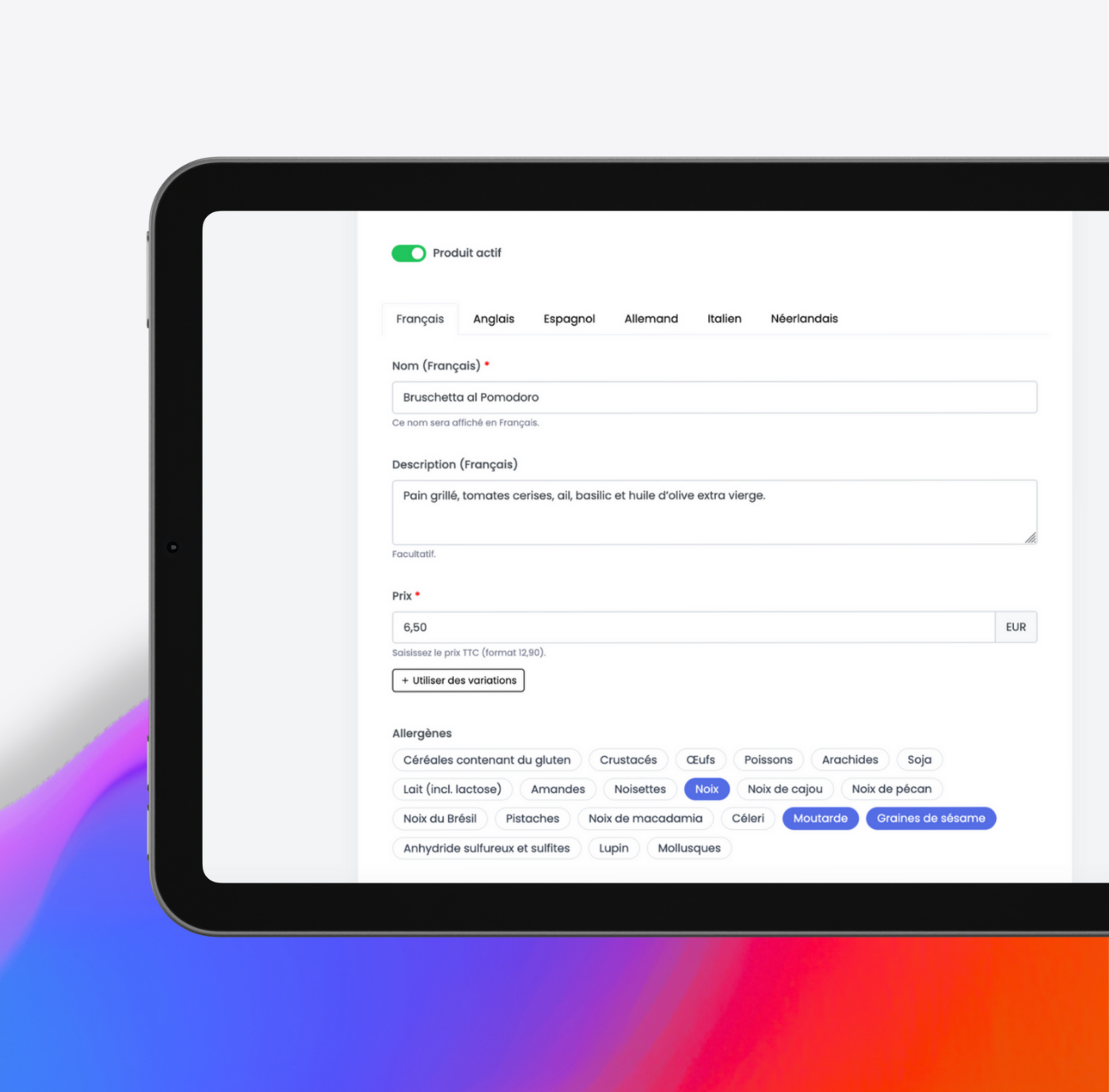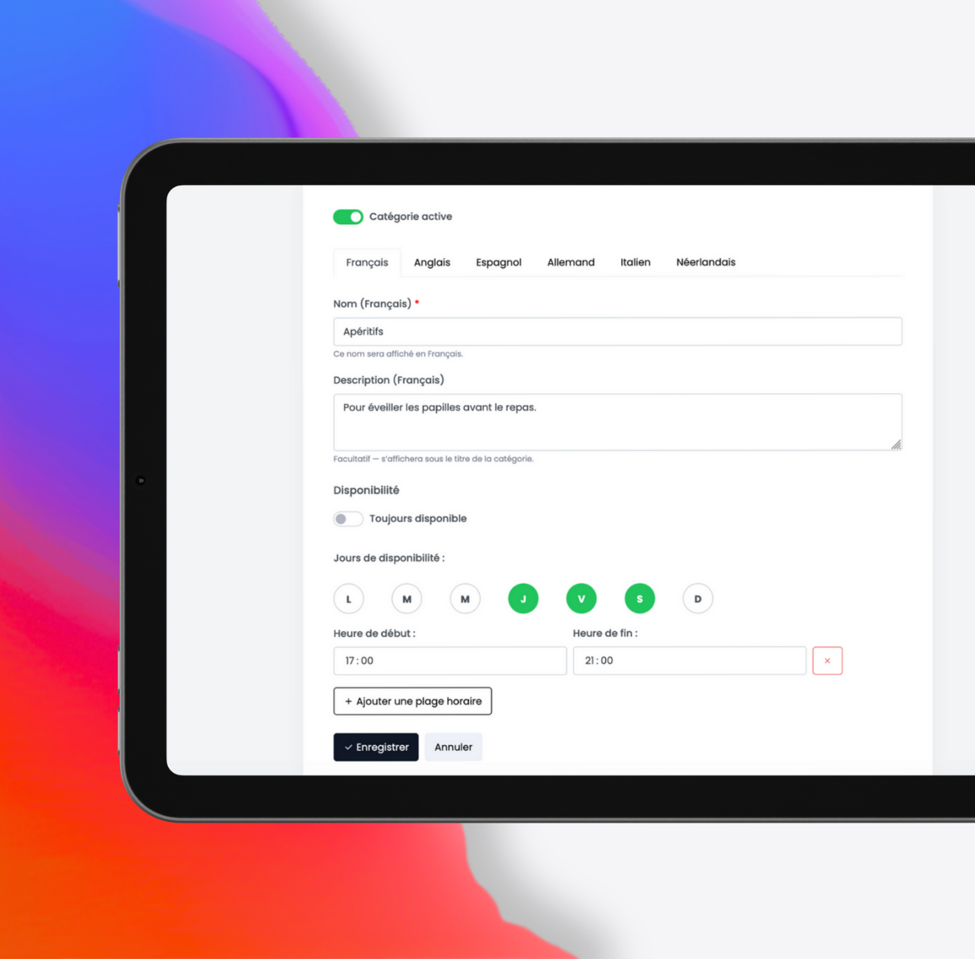 Vous ajoutez vos catégories, plats, boissons et menus directement en ligne, sans